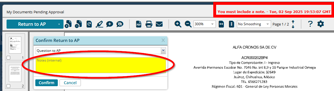 The invoice will now be routed back to the AP team for review. The internal notes will be contained in the Discussion Pane and viewable in the Notes field on the search screen.
