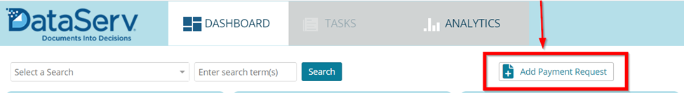 To add a Payment Request, a user logs into DataServ and selects the 'Add Payment Request' button located on the Dashboard to the right of the search bar.