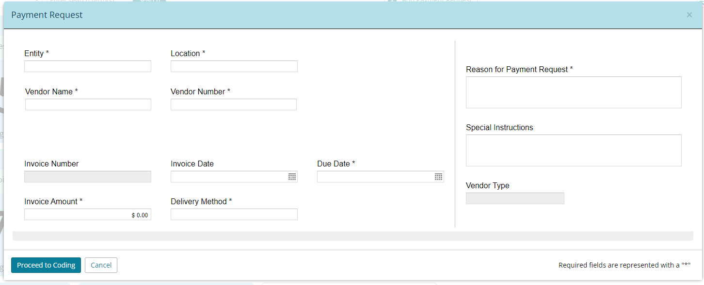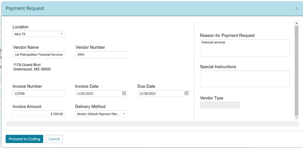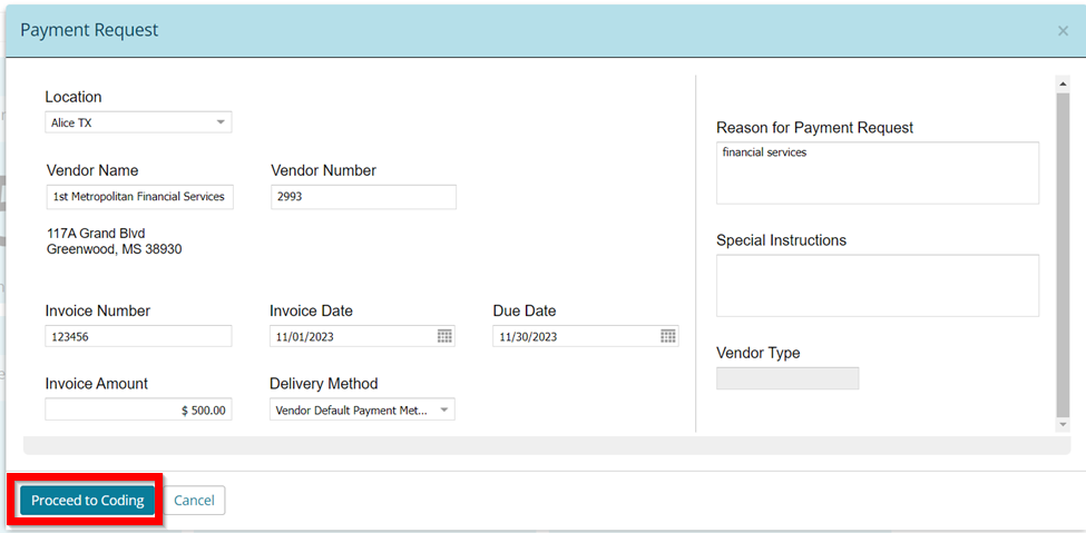 Once complete, click the 'Proceed to Coding' button in the lower left corner of the Payment Request data screen.