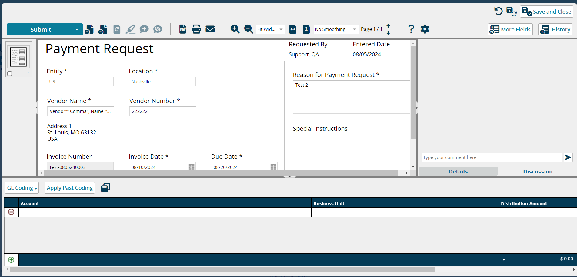 If you need to save a Payment Request and return to it later, you can click the 'Save and Close' button in the upper right corner of the Document Viewer to save and close it.