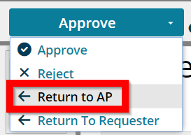 After reviewing the Payment Request, you can choose 'Return to AP' from the blue workflow button in the upper left corner of the Document Viewer for any necessary corrections, such as updates to the Payment Request or the need to reroute.