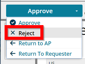 After reviewing the Payment Request, you can choose to reject it by selecting 'Reject' from the blue workflow button in the upper left corner of the Document Viewer. Rejected payment Requests will be marked with the status 'Duplicate/Void' and will not move forward in the process, nor can they be edited.