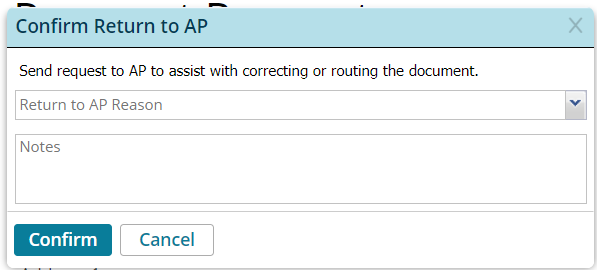 A confirmation box will appear in which you will need to select 'Return to AP' Reason from the drop-down. You can go ahead and enter any necessary notes by clicking 'Confirm' once you are done.