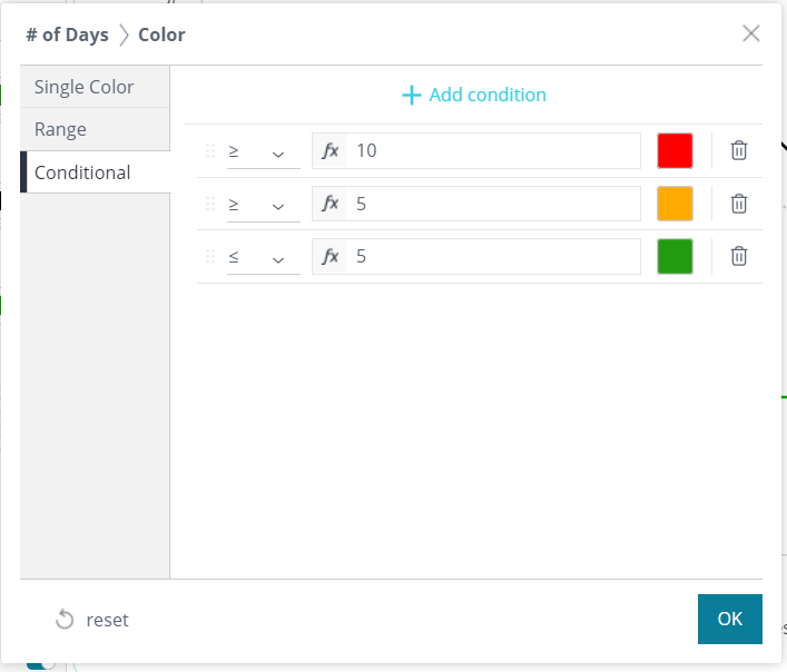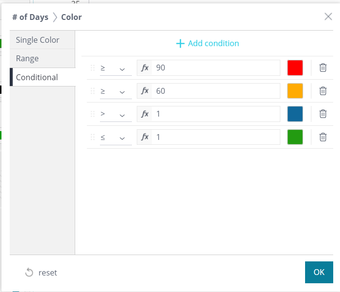 On the left column the '# of Days' is already setup to provide color coded values.