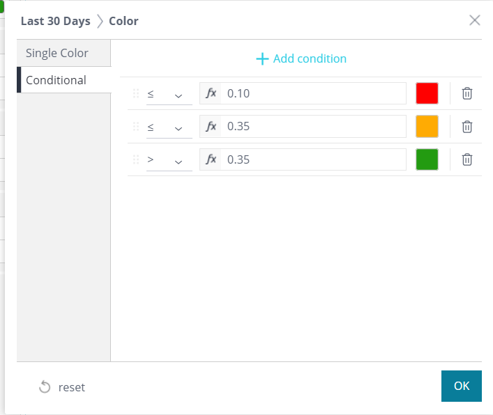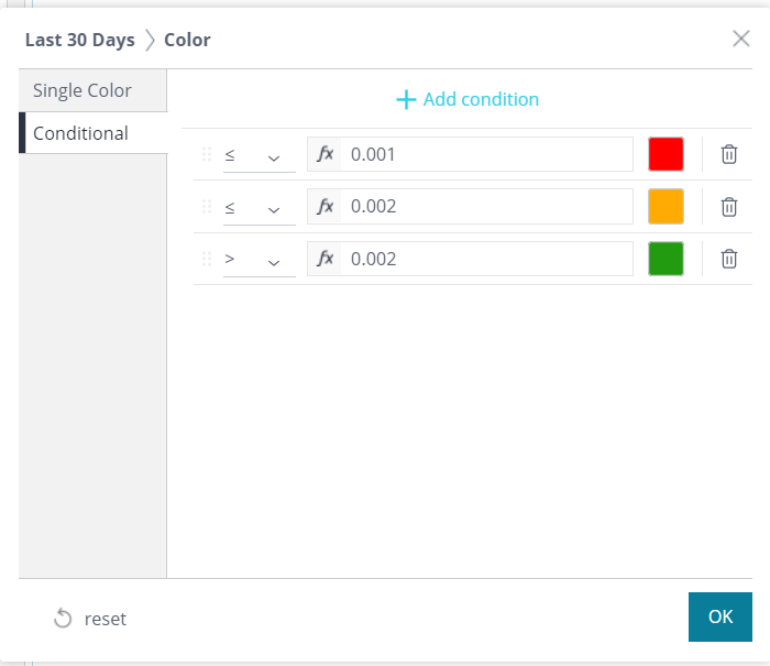 On the left column the 'Last Month' or 'Last 30 Days' value already setup to provide color coded values.