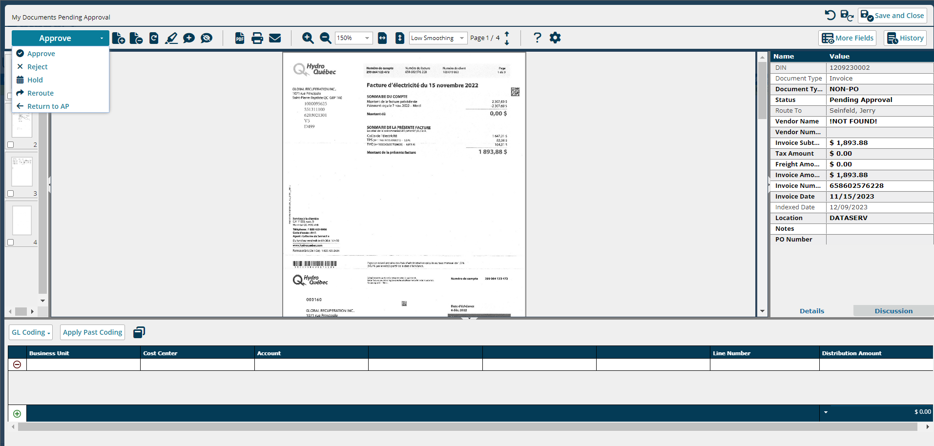 - Bottom pane navigation changes from tabs to a drop-down menu for GL coding, AP Invoice Detail, Workflow path, etc.