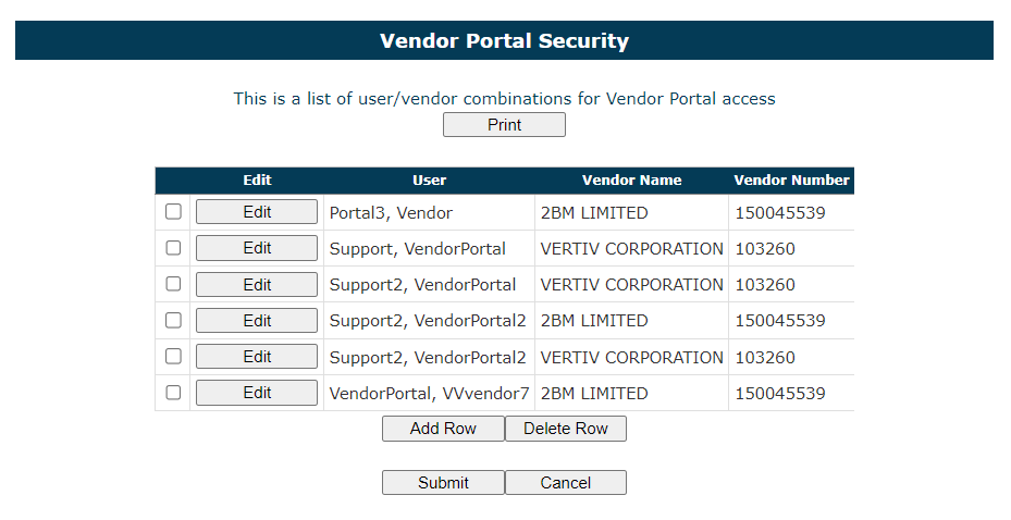 You can add, edit, or delete rows within the matrix from the Matrix-Vendor Security screen,
