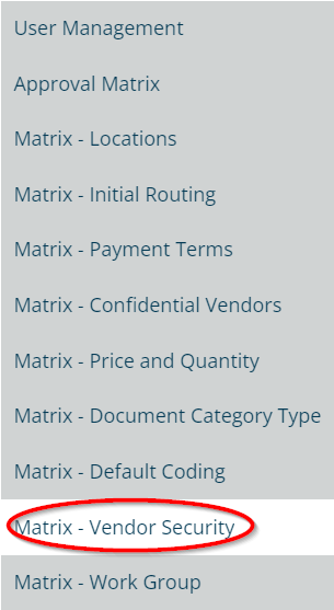 Within the Configuration Option, you can select the Matrix-Vendor Security.