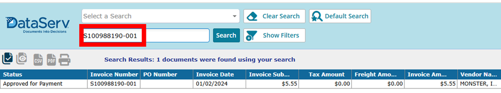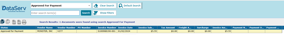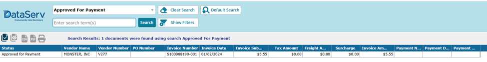 This search contains invoices that have been received and are currently being processed through DataServ.
