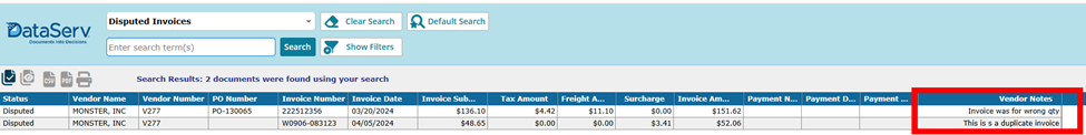 This search contains invoices that the customer has disputed. For information as to why, you can review the info in the ‘Vendor Notes’ field.