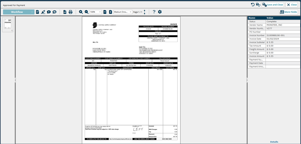 Once you are done viewing the invoice click the ‘Close’ button in the upper right and that will return you to back to the Search screen.