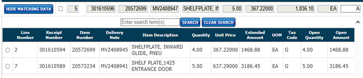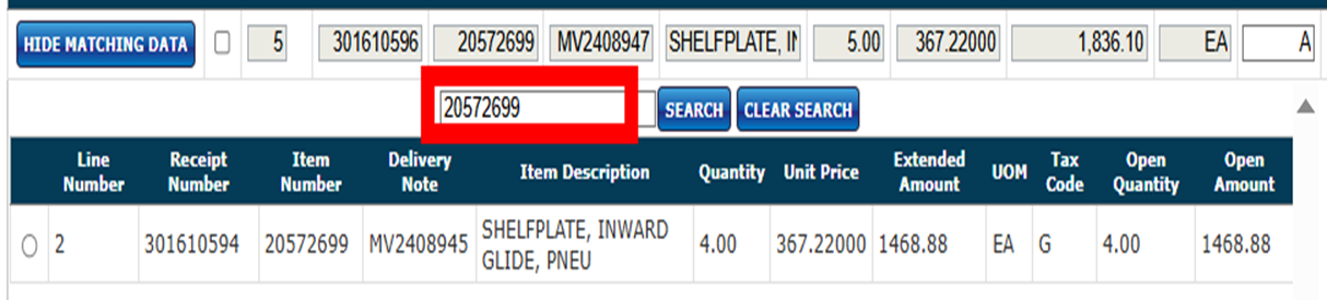 If the PO has numerous receipts listed, you can use the Search Item box to find the one you are looking for.