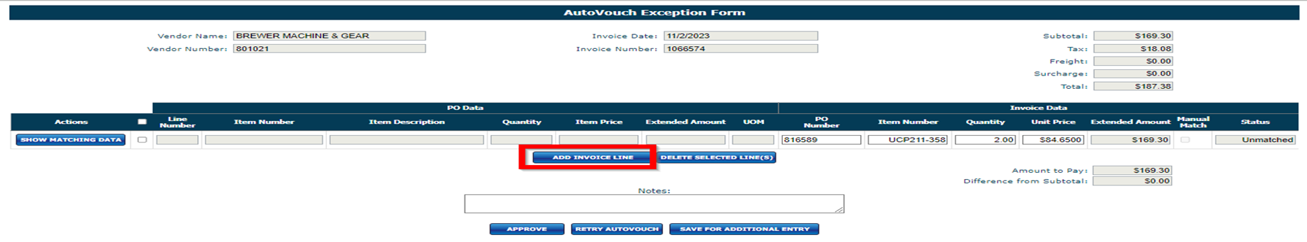 In some Matching Exception scenarios you will find the need to add lines to the AutoVouch Exception Form.