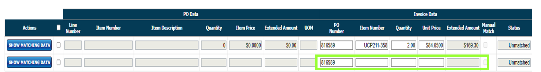 On the second invoice line you will need to enter your detail including Item Number, Quantity, and Unit price that matches your second PO/Receipt line.